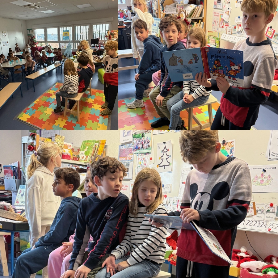 Les petits lutins des classes de CE1 passent chez les maternelles pour…lire des histoires de Noël ! Les enfants aux yeux écarquillés s’en régalent, et cette petite aventure est très bénéfique pour les lecteurs. Merci aux enseignantes qui organisent ces belles rencontres.