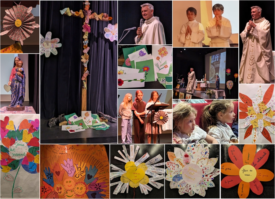 La joie de fêter la résurrection de Jésus et de prier ensemble s’est manifestée pendant les cérémonies de Pâques, célébrées par le Père François-Régis de la maternelle aux CM2. Chaque classe a offert un cadeau, en forme de fleurs, disant « Jésus est vivant ».